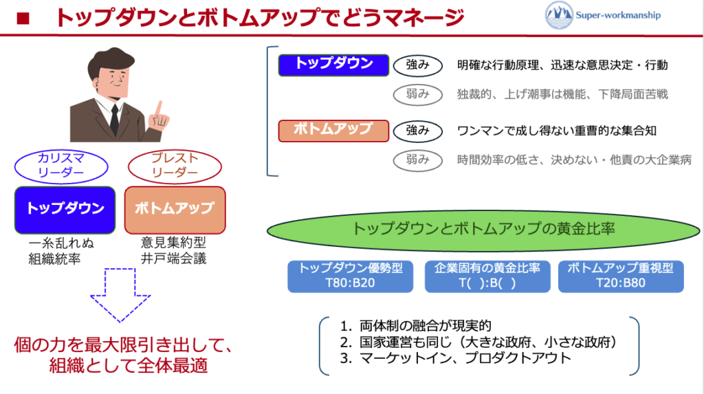教科書的には、トップダウン50、ボトムアップ50がバランスの取れた理想の組織体系となりますが、現実の企業の運営手法は、トライアンドエラーを繰り返し当該組織体にとって絶妙のバランスを見つける苦難の連続です。経営状況、求められる成果等で都度バランスを調整していきます。経営の達人、実績の出せる組織リーダーはその黄金比率を掴んでいます