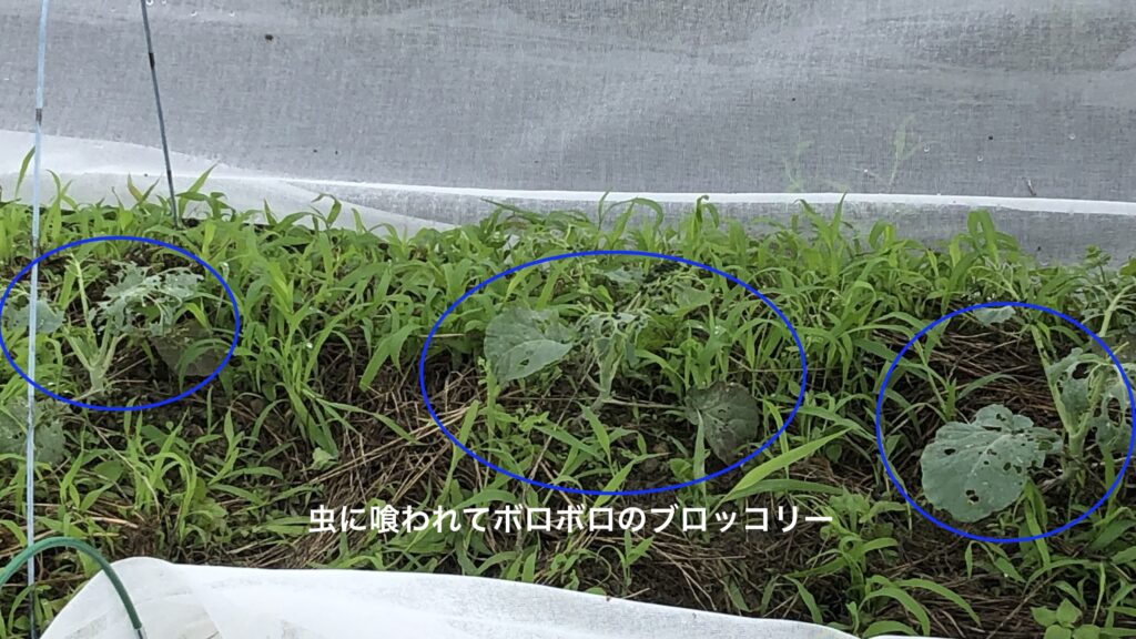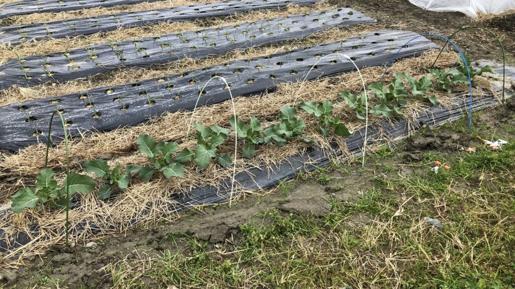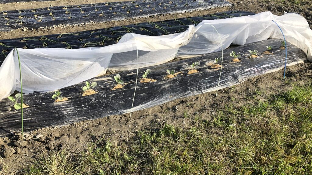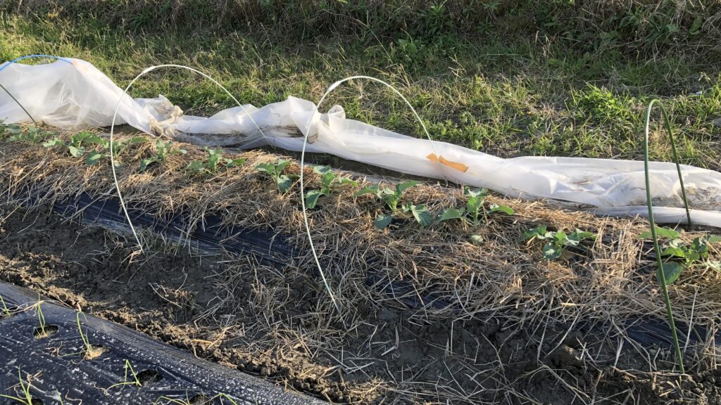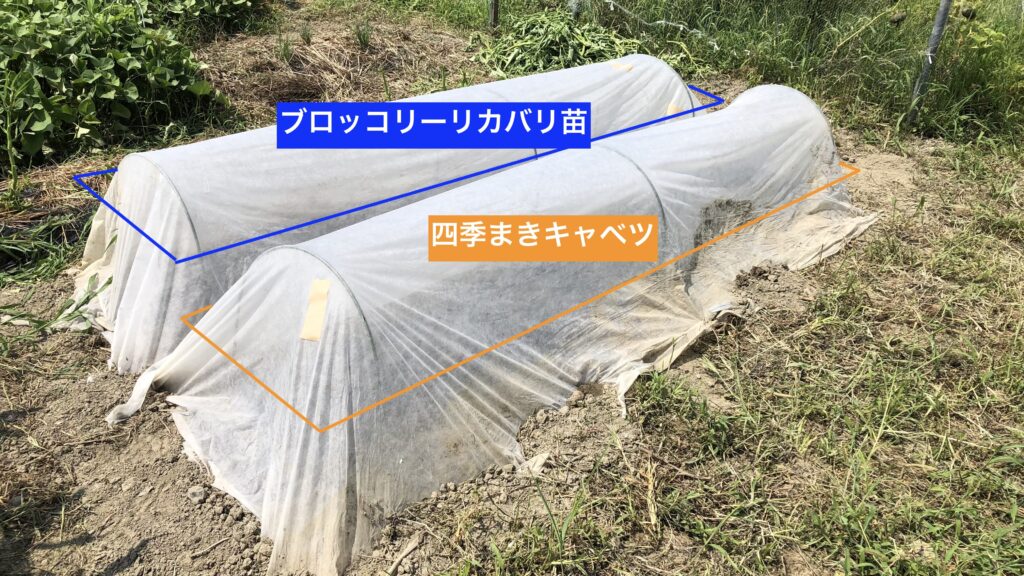 ブロッコリーのリベンジを期して、8/12にブロッコリー、四季まきキャベツ、白菜を育苗ポッドに種まき、1週間で発芽を確認。8/23にブロッコリーと四季まきキャベツを隣り合わせで定植。まだ暑さが残っているので不織布をかけて虫対策を万全にする。