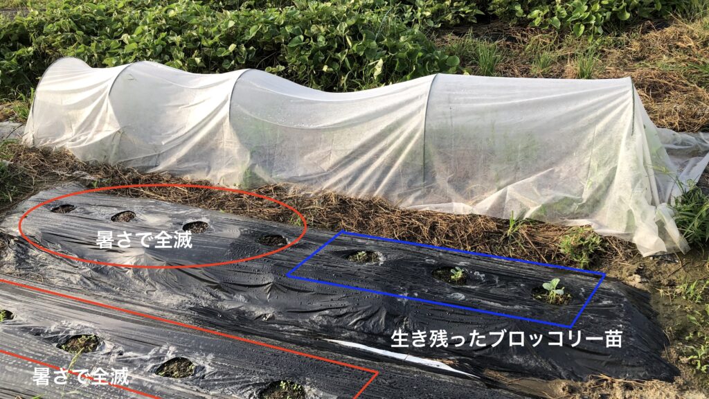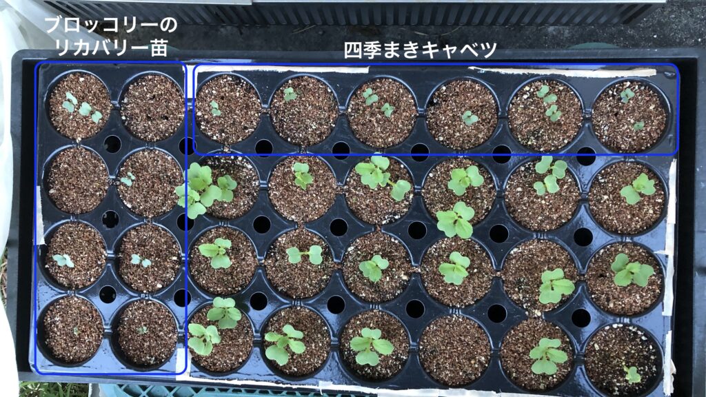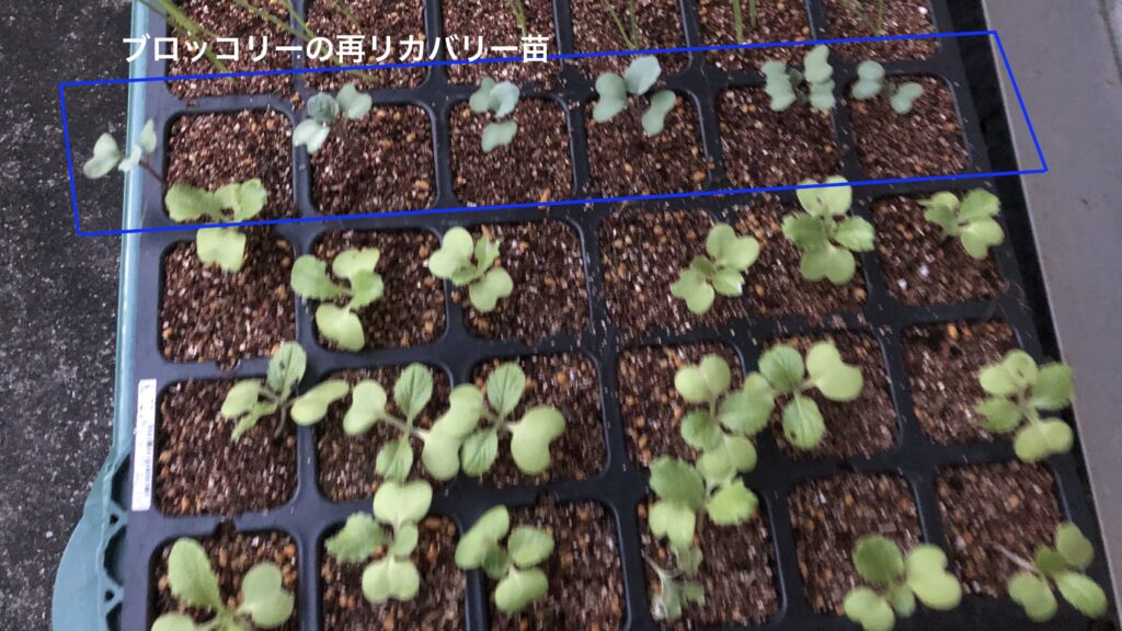 定植後2週間で、ブロッコリー苗の半分と四季まきキャベツ苗全てが暑さでブッ飛び!「ちょっと週末菜園では葉物は無理か?」と自信を失います。残った3株ももう処分しようかと思ったけど取り敢えず放置プレー。それでも再々度、ブロッコリーの再リカバリー苗を9/12にポッドに種蒔きして育苗、1週間で発芽は確認。