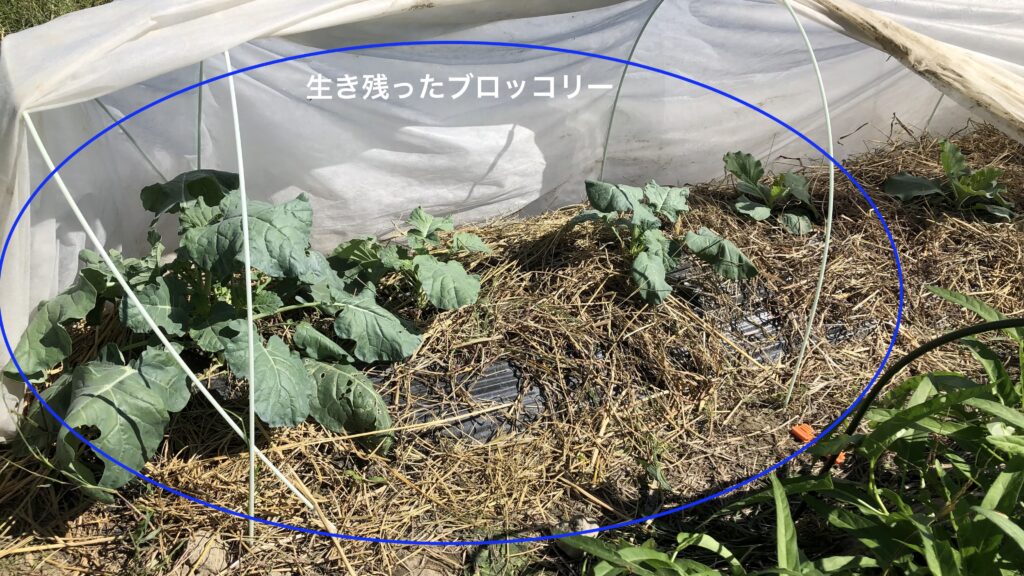 約1ヶ月放ったらかしで不織布を剥がしてみると、何とあんなに小さくまた暑さと虫食いでブッ飛びそうだった3株が見事生き残って、特に左の株は隆々としていて、初めてブロッコリーでここまでの成長を確認することができた。また同日、再リカバリー苗も白菜のリカバリー苗と合わせて定植。