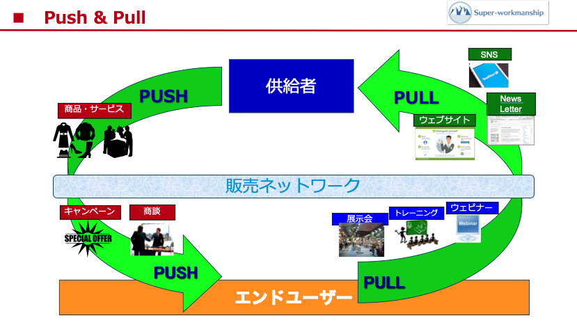 語呂がいいのでPush&Pullと呼んでいますが、実際はまずPULL「市場で引き(需要)をつくって」、そしてPUSH「販売側(供給)が押していく」という戦術です。例えば新製品の宣伝をやって消費者の関心を喚起すると、市場で新製品への引きが生まれる。大手小売店やチェーンの流通に乗せて製品・サービスを供給販売していく。1️⃣製品・サービスそのものの価値の強さ、2️⃣流通網のカバレッジ、3️⃣販売キャンペーン、4️⃣スペシャルプライス等々、マーケティングの4Pの要素を織り交ぜて、「引いて、押して」の流れに乗せていく基本戦術です。