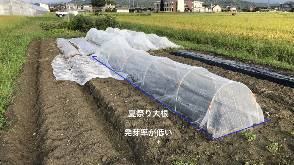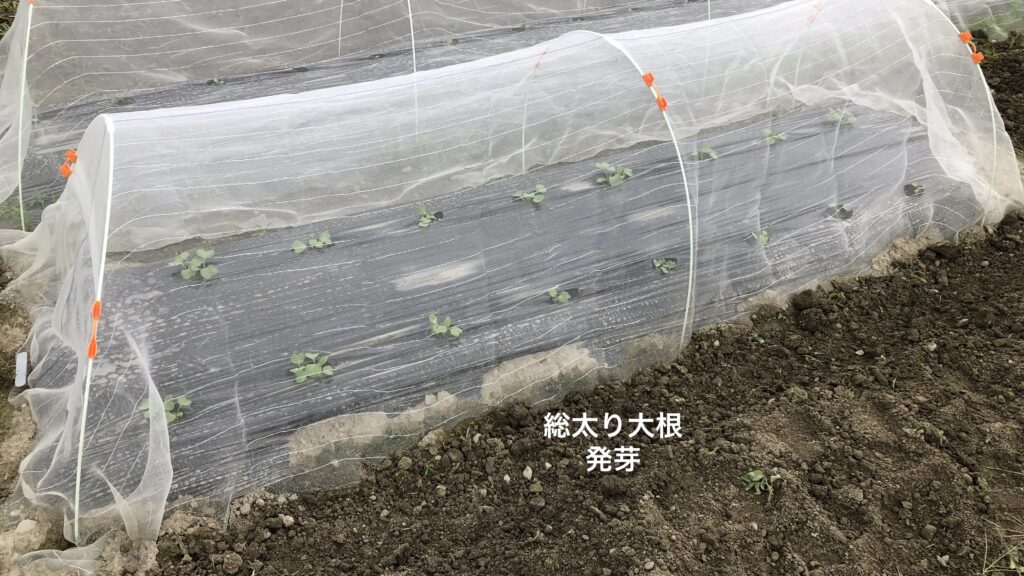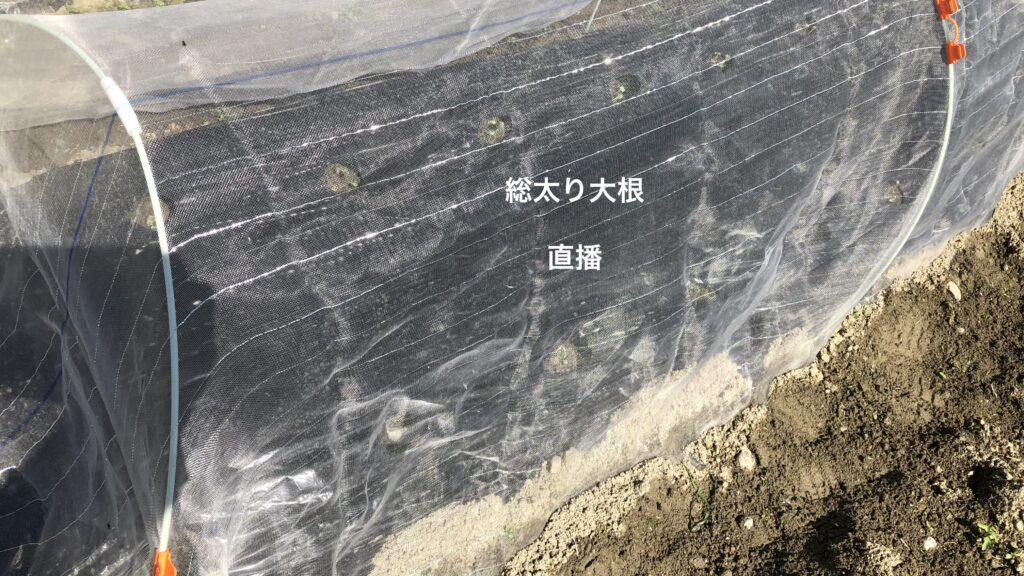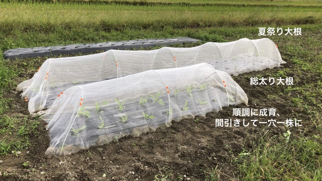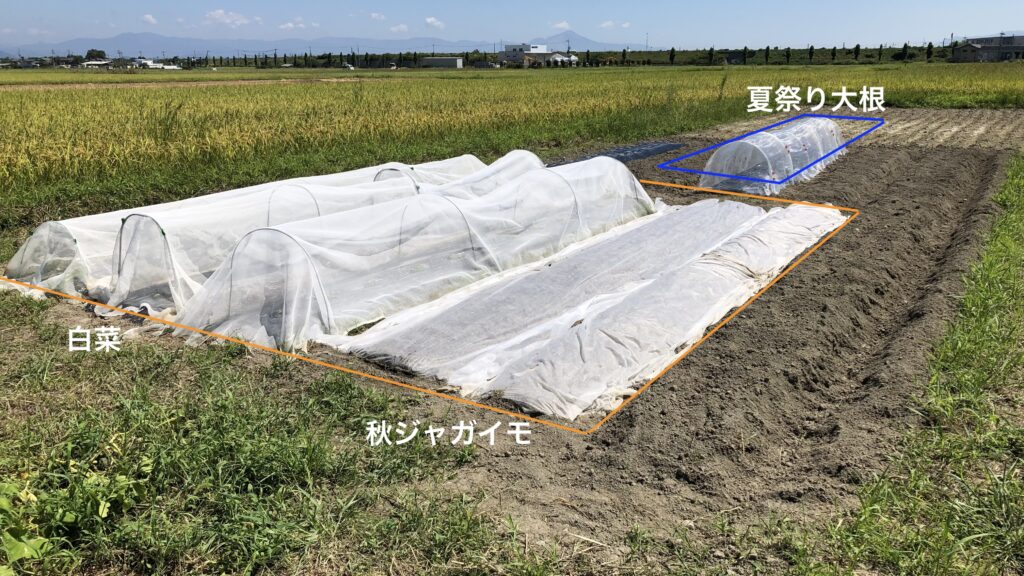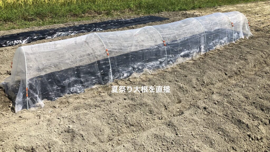 白菜と秋ジャガを一週間先に仕込んで、8/31にもう一度軽く耕作後に「夏祭り大根」の種を30株直播しました。まだまだ虫の多い時期で初期の対策が大事なので、銀色の光を反射する糸が入った防虫ネットを購入して虫が入り込まないようにガッチリとセットしました。