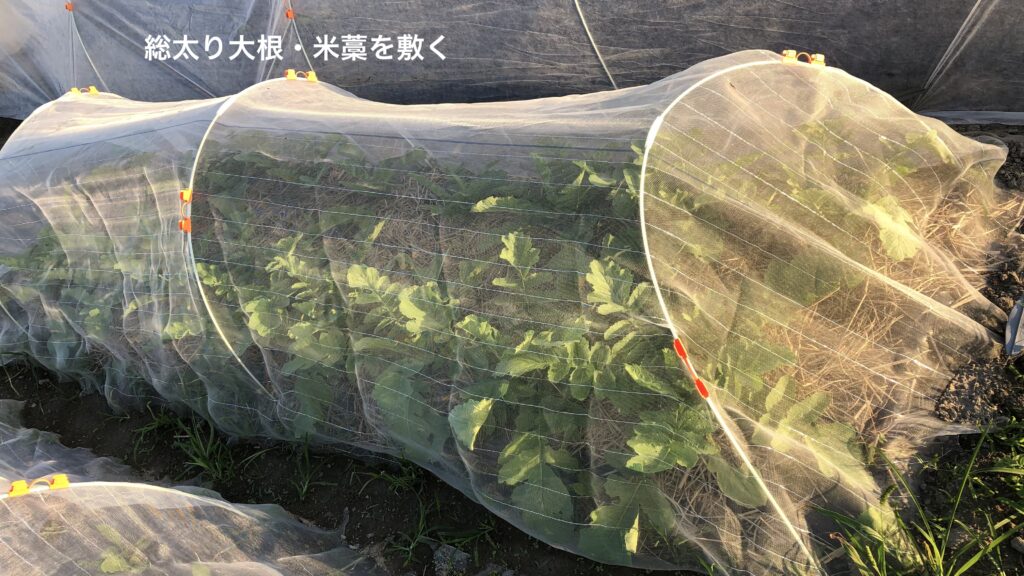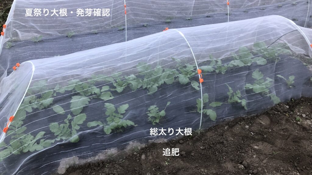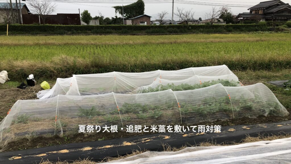 「総太り大根」は順調に成育し、白い首が見えるものが出てきたので全株土寄せ。「夏祭り大根」は成長軌道に乗ったので、追肥を行い米藁を敷いて雨対策も施した。