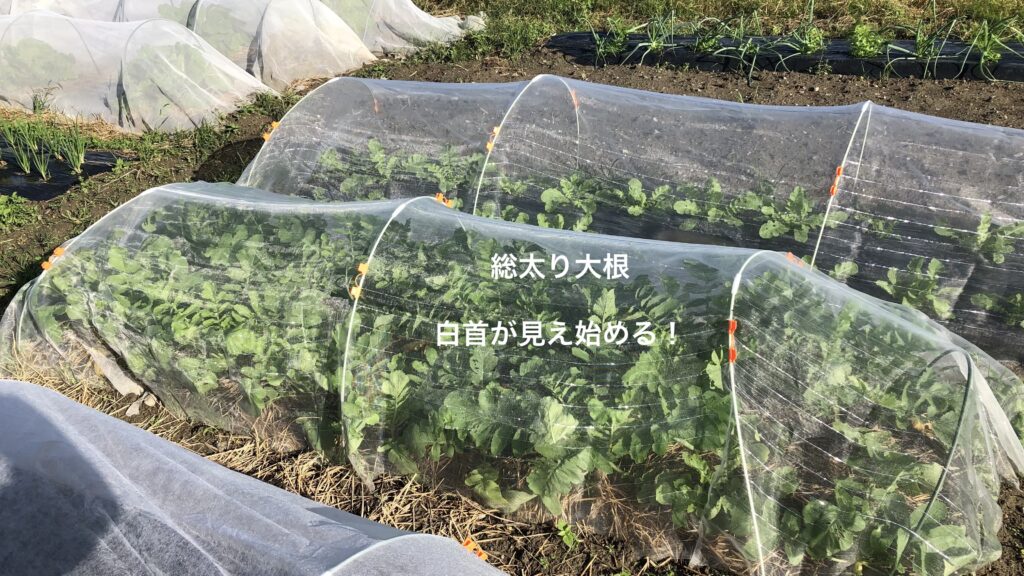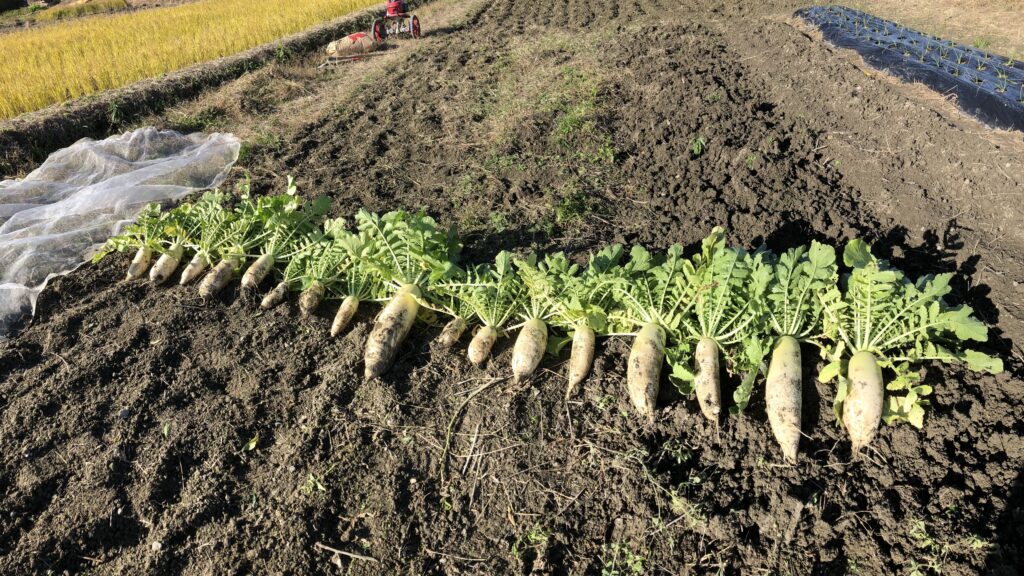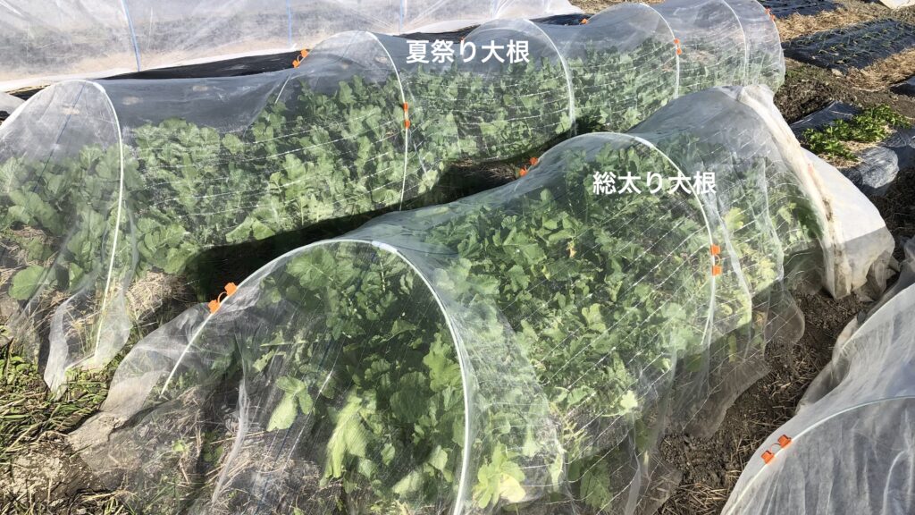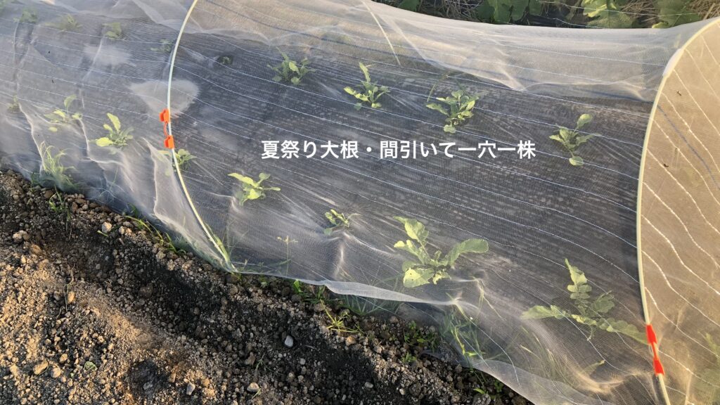 でっかい大根を引っこ抜く様は、農業を始める前には一度やってみたい玄人仕事という感じでした。夏野菜に追われている間は水やりと収穫に忙しくて、すっかりその思いも記憶から消えていました。しかしお盆を過ぎて白菜に着手し始めると、大根は白菜と同様に家族の期待が高い秋冬野菜の定番であると認識し、量産に向けて取組み始めます。大根はあれだけ大きい長尺のものが地中にできるので、フカフカの土が決め手と思いしっかりと耕しました。また直播が基本なのでできるだけ土の状態がいい時を選んで種を蒔いて、初期の虫対策も万全にすべく初めて防虫ネットを購入しています。成果物ががっしりしているので、最後の瞬間が玄人仕事のようになるか楽しみな野菜です。