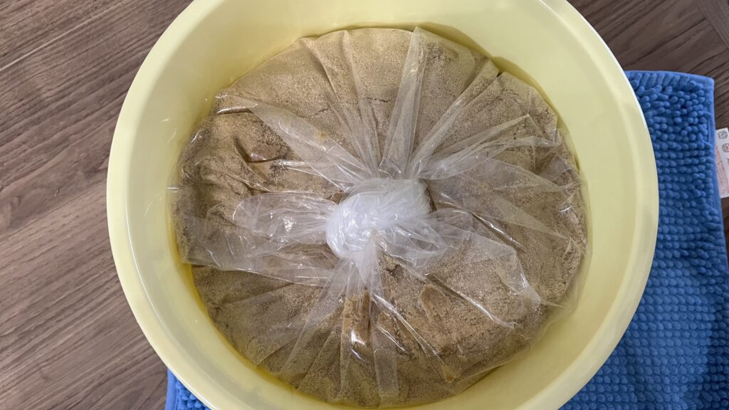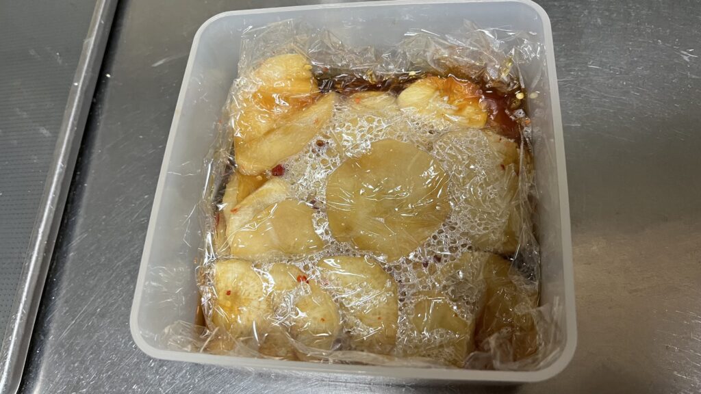 1)大根を干しカゴで3週間 2)グニャグニャになったらOK 3)すぐき風と同様に塩揉みして米糠を敷き詰めて密封 4)漬物石で重しを約4週間