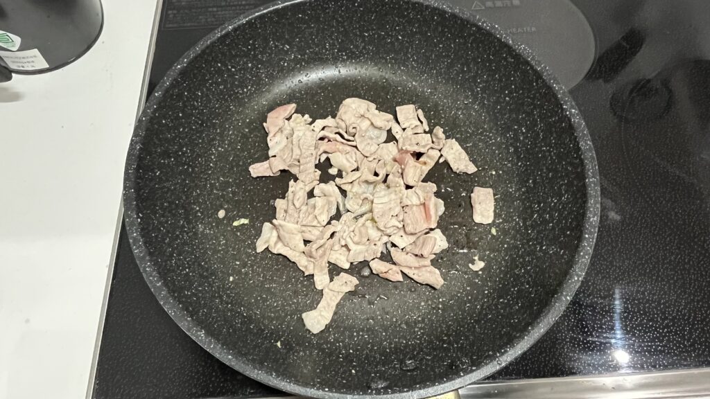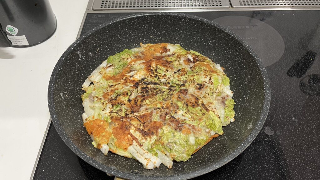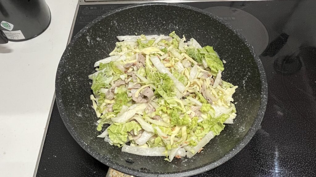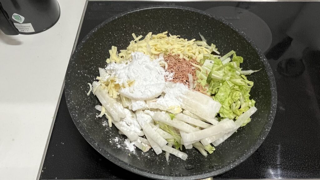1)豚肉だけ先に炒める 2)大根は軽く塩で水抜き、白菜はざく切り 3)4)具材をフライパンで混ぜ合わす(片栗粉、小エビ、鷹の爪、ピザチーズ等を加える) 4)10-15分両面焼き(油は引いておく)