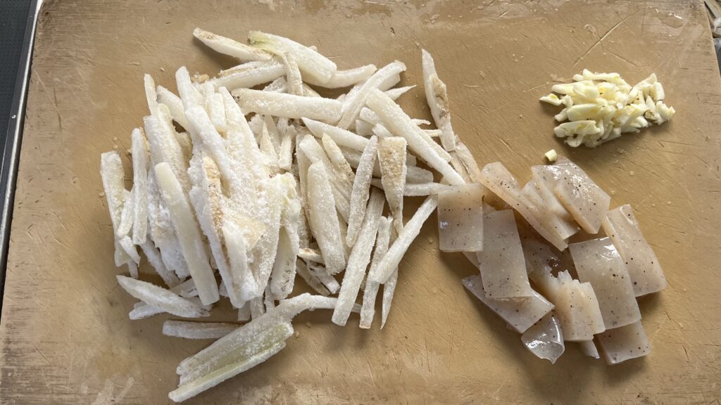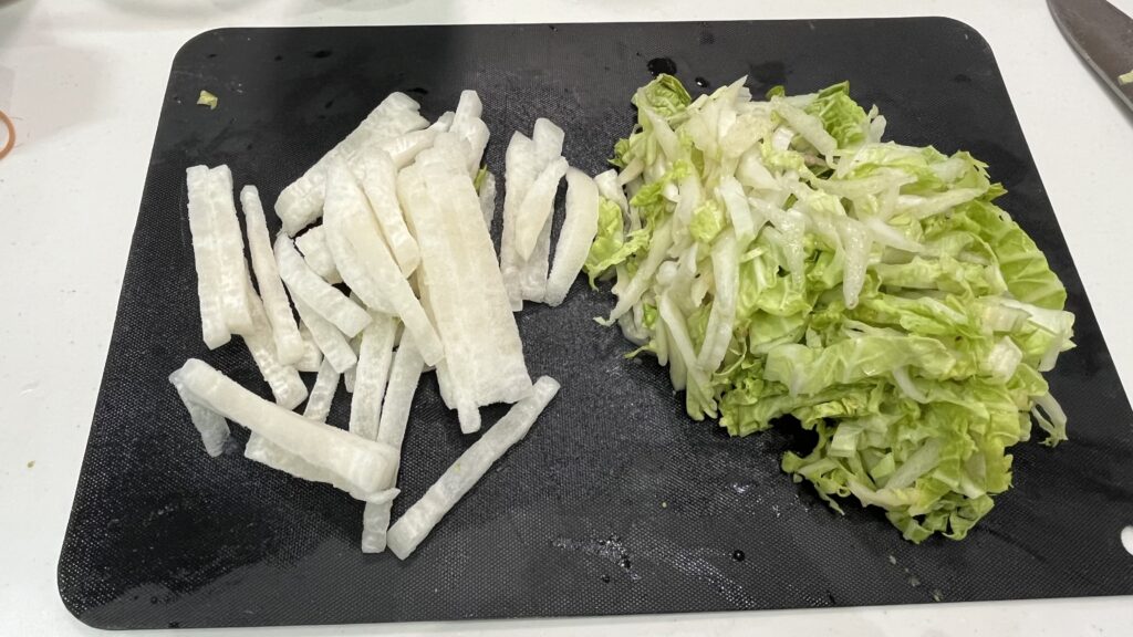 要は大根を細く切って軽く水分を抜いて片栗粉を加えて熱を加えればお餅みたいになります。後はお好みで色々トッピングです。白菜も大量消費したいのでお仲間として加えました。