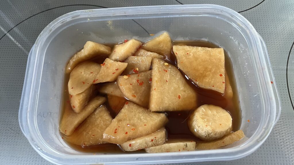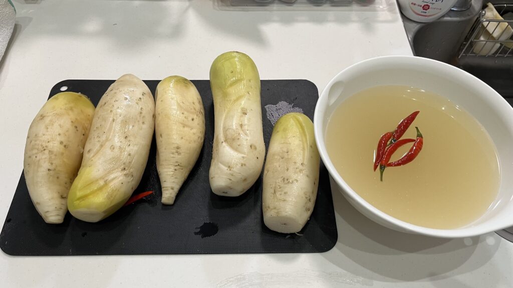 1) しなしな大根、漬物残りを一口サイズにカット 2)醤油4、お酒3、みりん2、酢2、砂糖少々で漬け汁を沸騰 3)大根、鷹の爪を入れて再沸騰で火を止める 4)ラップで覆って冷蔵庫で寝かす 5)30分で食べれます。翌日はなお美味しい!