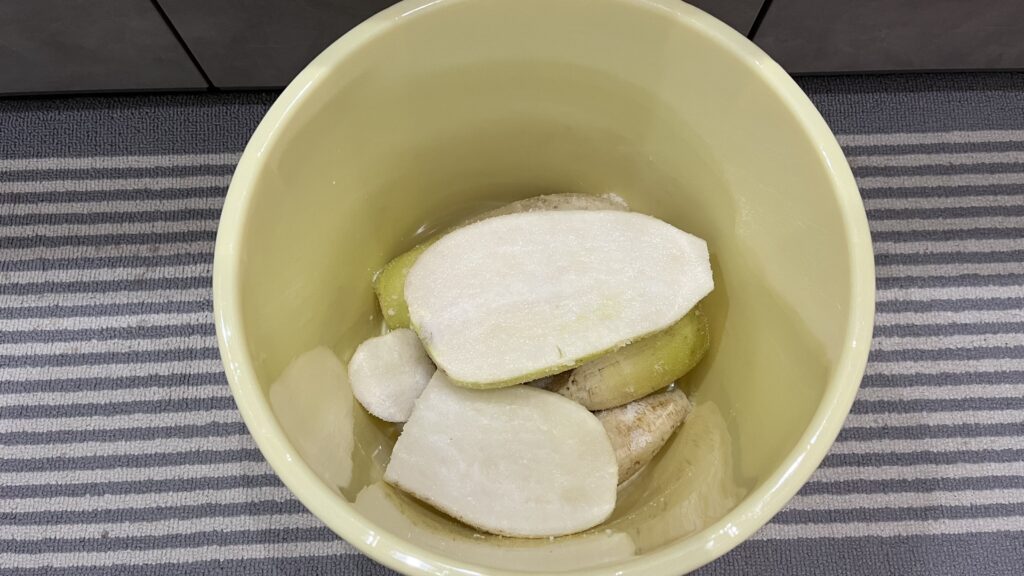 大根加工で外せないのはやはり「たくあん」! 糠漬けには少し抵抗がありましたが、米糠は当地ではコイン精米機に取りに行けば簡単に手に入るので、すぐき風漬けの延長でやってみました。干して水分を抜く工程が加わりますが、より丹誠なプロセスで旨みが凝縮する感じです。
