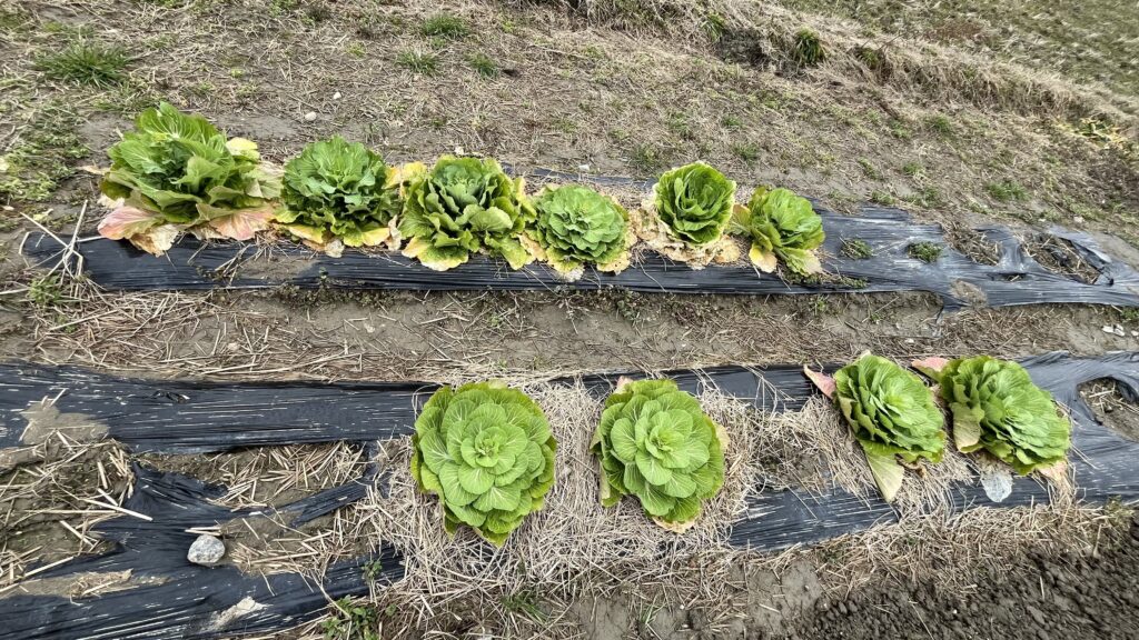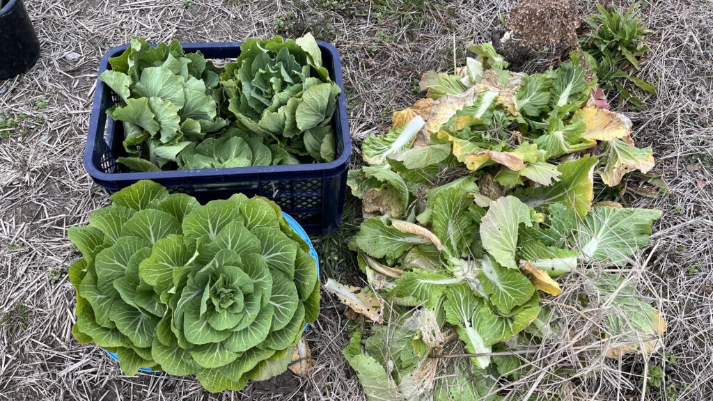 雪解けして2月末に暖かい日が続きましたが、一向に変化の兆しがなく「これはもう巻かないな」と直感し、収穫を決めました。お裾分けもできる形でないし、このまま保存して食べるのも少々難儀だなと少し思い悩んでいました。かと言って処分は勿体無いし。昨年の猛暑でぶっ飛んだ苗のリカバリーとしてここまで育ててきた株なだけに、思いもひとしおです(リカバリーの白菜)。