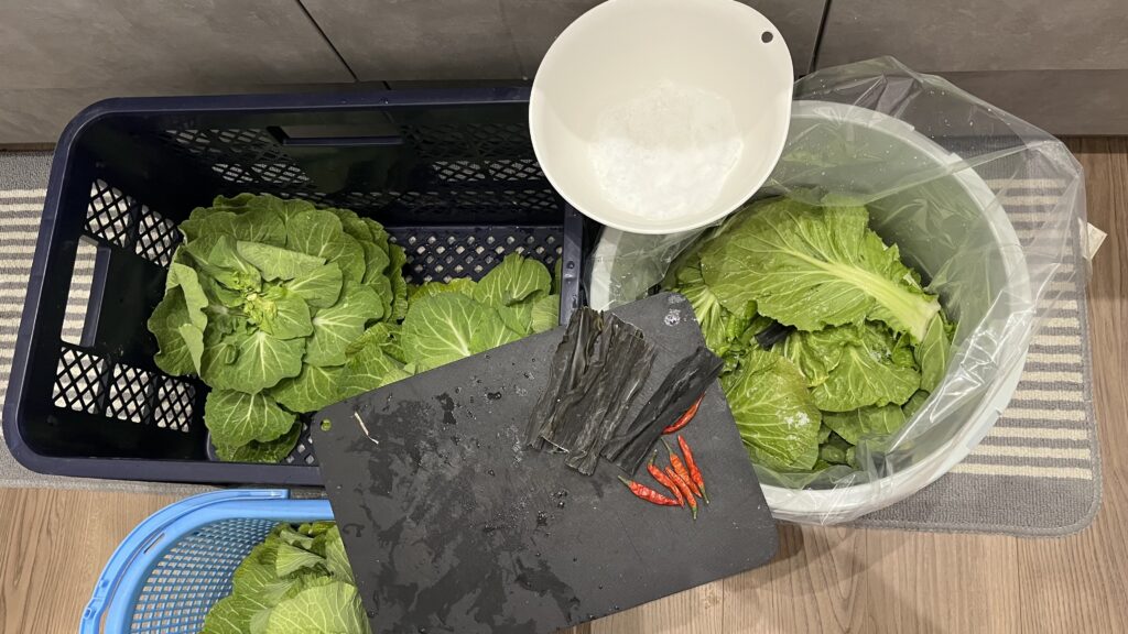 1)きれいに洗った白菜が今回は3.5kgあったので5%弱(170g)の粗塩を用意、樽は20Lを使いました。塩が効くように芯は十字に切り込みを入れて塩をすり込み、束ごと樽に塩を振りながら重ねながら漬けていきます。この時に一層毎に昆布と鷹の爪も入れていきます。
