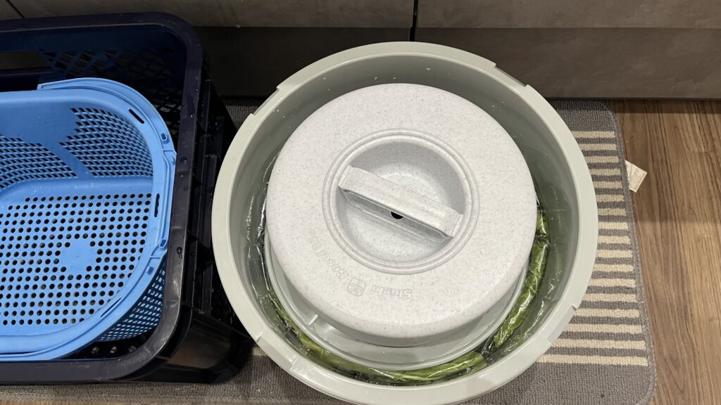 2)嵩が多いのでギュウギュウ押しながら全部敷き詰めたら、漬物袋を空気が入らないように縛って完了です。
