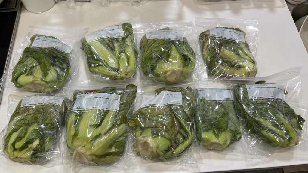 5)一束毎にジップロックの中サイズにパッキングして、お裾分け用のセットが8個できました。結球しなかった白菜も立派な姿になりました🙂↕️