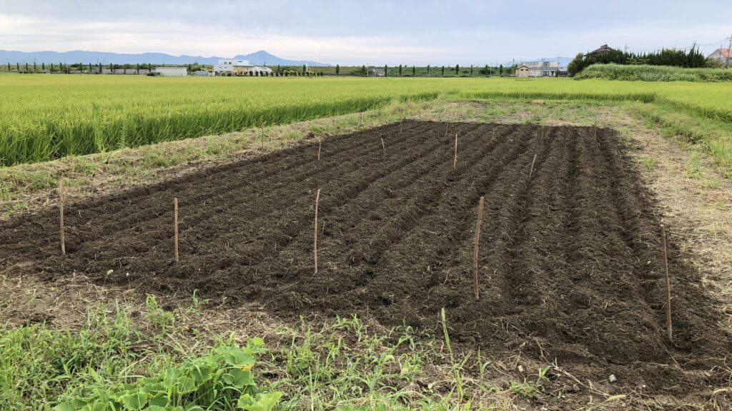 苗も仕込んだし、まだお盆も来ていないけれど、そろそろ白菜はじめ秋野菜のための土づくりを開始です。1週間前の8/2に畑5-6を耕して、腐葉土、完全堆肥を漉き込んでました。前日に久しぶりの雨でちょうど良い塩梅で土が湿ったので一気に畝立てをしました。