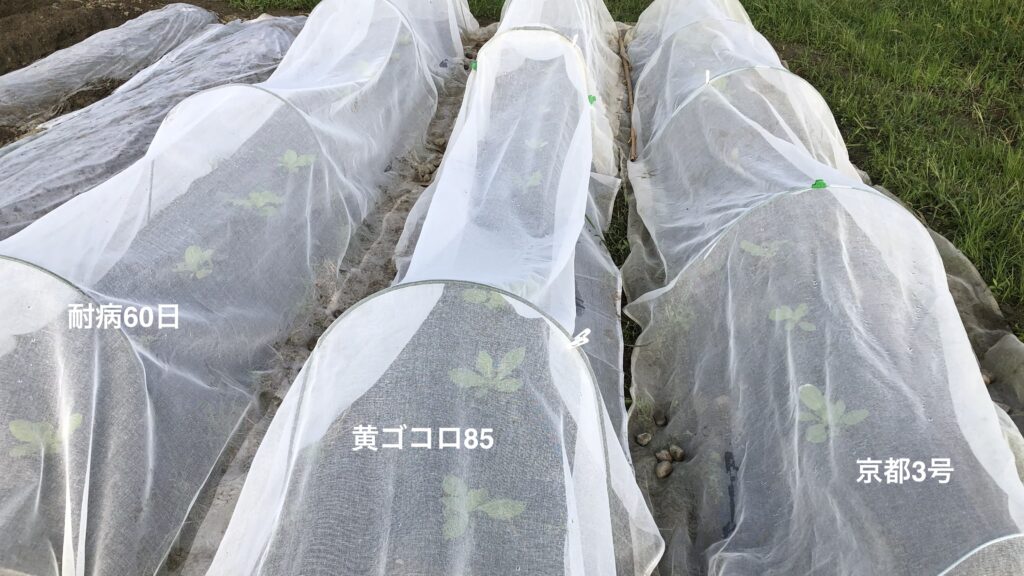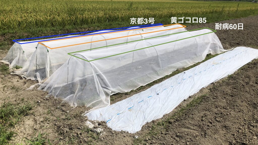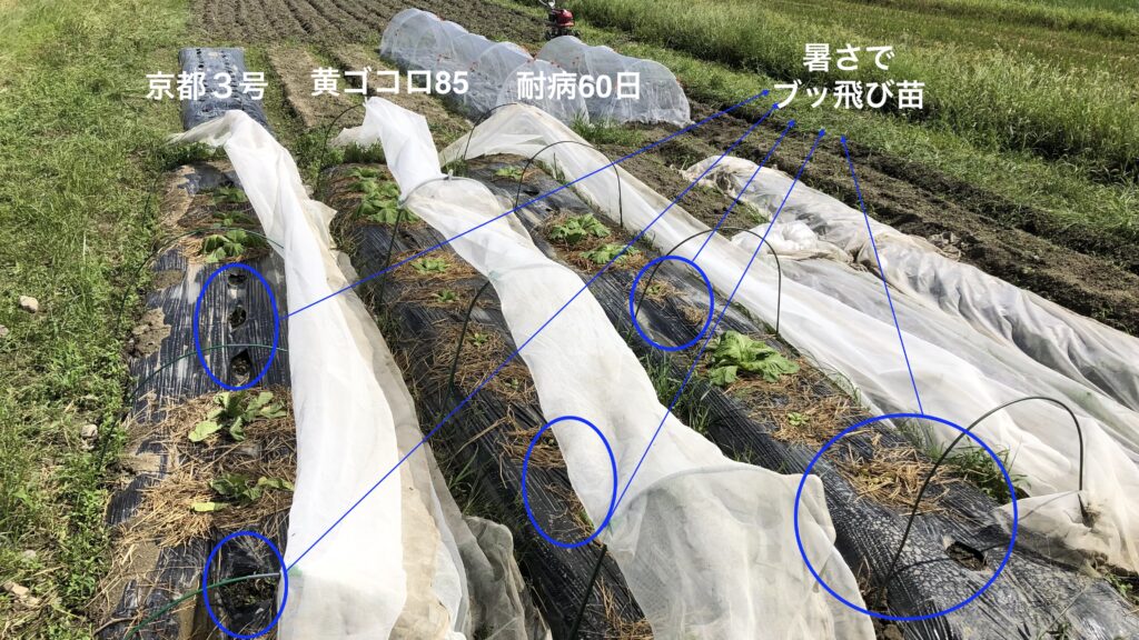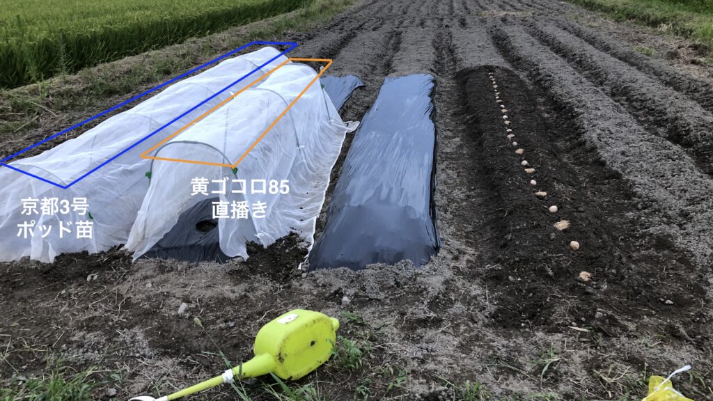 続いて「京都3号」の苗が発芽して10日になるので思い切って11株定植です。まだ苗が弱々しいので暑さも強いので寒冷紗で保護して、少し土寄せも行って夕刻に定植完了です。一方土は湿っていて状態が非常に良いので、「黄ゴコロ85」は思い切って6株直播しました。