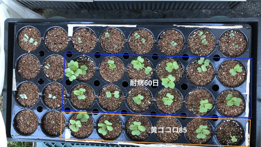 バックアップも含め「黄ゴコロ85」「耐病60日」のポッド苗を8/12に仕込みます。1週間で発芽は確認。8/22は土の状態がそこそこ湿って良かったので夕刻17:00に一気に定食へ。「京都3号」は暑さで3株がブッ飛んだので直播でカバー、「黄ゴコロ85」はポッド苗x5が10日目なので定植して、先の直播と合わせて11株。「耐病60日」は全てポッド植えの10日苗を11株定植。三種とも11株ずつの仕込みです。何とか30個採りたいな!