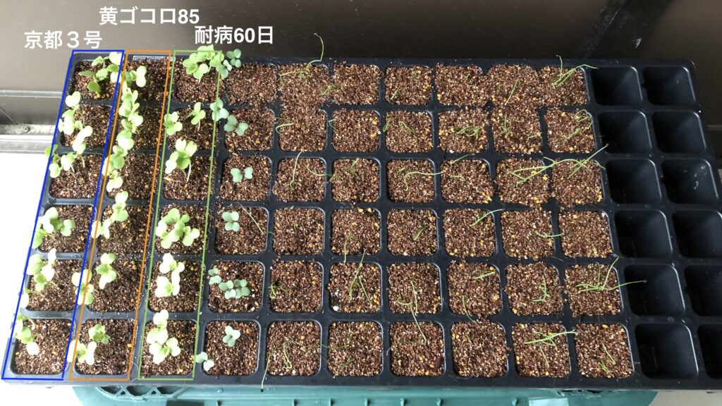 白菜のポッド苗を仕込みます。「京都3号」、「黄ゴコロ85」、「耐病60日」の三種に取組みます。それぞれ10日間づつ位時期ずれで蒔いていきます。今日は京都3号を手堅くポッド苗に蒔きます。
