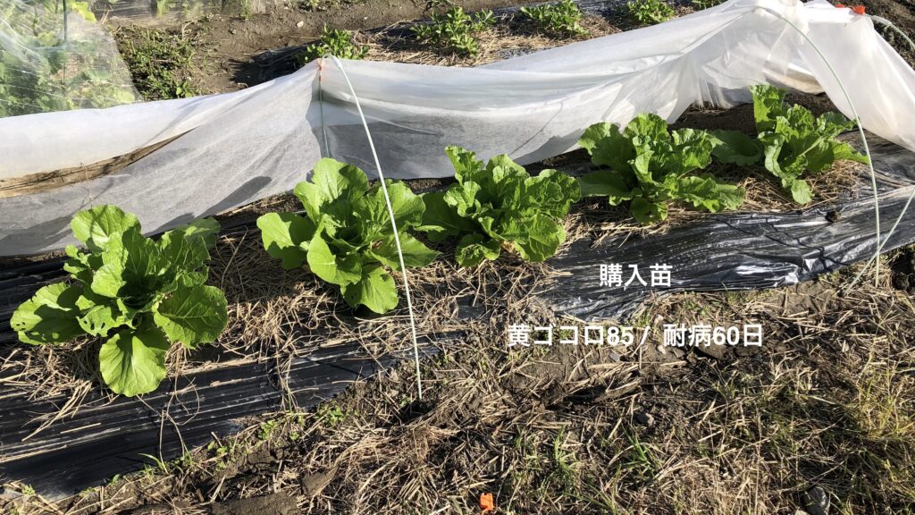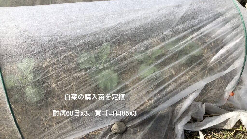 白菜のリカバリー苗、京都3号x5、黄ゴコロ85×5、耐病60日x6を定植。この日はえひめAIの液肥で活着スイッチオン! 既存株は結球に向けて同様に液肥を与えた。また白菜の出来高確保のため、耐病60日x3、黄ゴコロ85×3の苗を購入して畑5の畝6に定植。