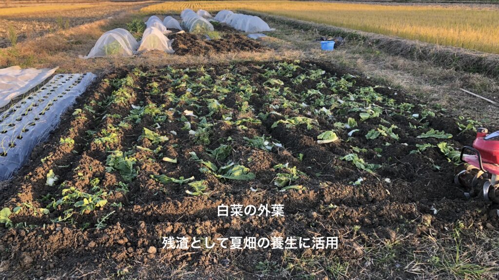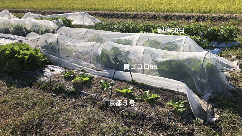冬と言えば暖かいお鍋。お鍋と言えば欠かせないのが新鮮な白菜。まさに冬野菜の代名詞とも言える白菜は自分が好きよりも、家族の期待が非常に大きくてかなり具体的な要望があった野菜です。ということで夏野菜に夢中になっている時も準備のタイミングを逃してはならずと、まだ暑い汗だくの最中から何かと気にかけて来た野菜で少々肩に力が入っていたかもしれません。夏野菜の生命力溢れる成長ぶりにならされていると、ついつい秋冬野菜も畑に入れれば後はOK的な思い込みがあって「早めの準備」「成長の見守り」をイメージしていましたが、白菜の難しさを痛感することになりました。家族の要望で出来高目標があったので後に引けないプレッシャーが良かったのかと思う白菜づくりです。