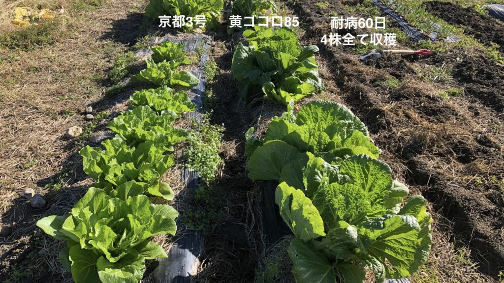 一番苗は触ると固い感触で結球が確認できるため収穫の運びとなった。まず「耐病60日」を収穫。こちらは一番苗x4のみが残り、リカバリー苗は消滅! 中ぶりながらしっかり結球できた。
