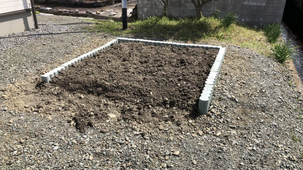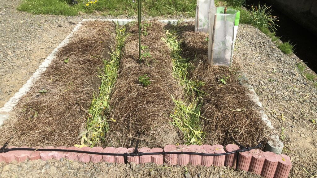 自宅前の10m2は、そのままにしておくのも勿体無いので、その頃夢中になって考えていた「自動灌水装置」の実験場として一旦仮設畑にしました。畑から土を運んできて縁石で囲って、多分花壇にするのが一番合っていたのかもしれませんが、勢いでいくつか苗も植えました。