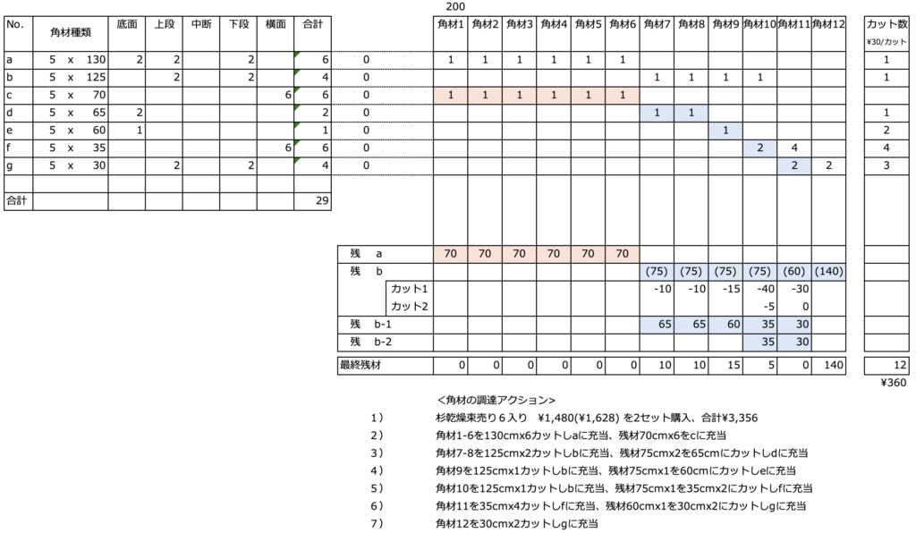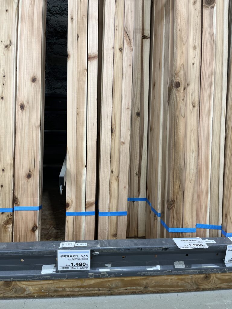 既にプランしてあるので、目星をつけておいた材木束を購入して、パネルソーでおじさんにしっかり指示して切ってもらいます。それでもちょっと目を離すと今回は一本カットミスが出ました(まあややこしい事を頼んでるからね、しょうがないけど😮💨)。材料費はカット代込みで¥3,619なり。