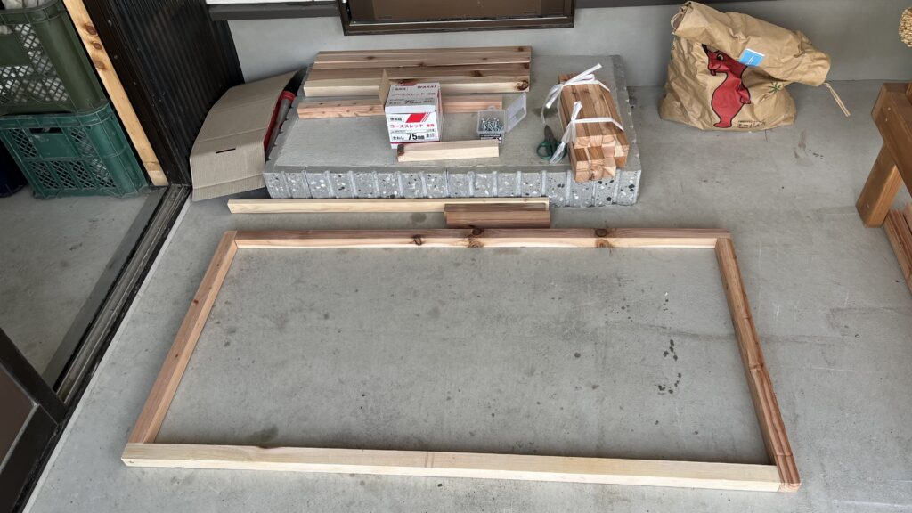 基本的に角材同士を、コーススレッドを打ち込んで接合していきます。使うのはインパクトドライバー。釘打ちより簡単で強度もあります。今回使ったのは角材が35mmなので、57mmのコーススレッドと強度が欲しいところは75mmのコーススレッドを使いました。組立途中で寸法ミスが見つかり(カットミスでない、設計ミス)、何とか手作業の接木で乗り切りました。組み立て始めは結構グラグラして大丈夫かなって感じでした。