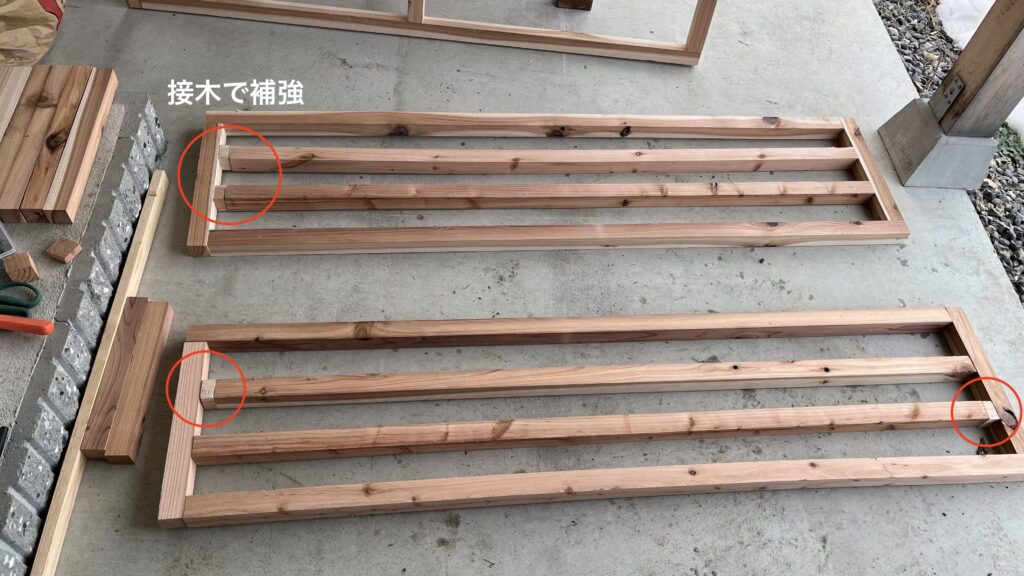 手作業で作った接木で寸法ミスの部分を補強