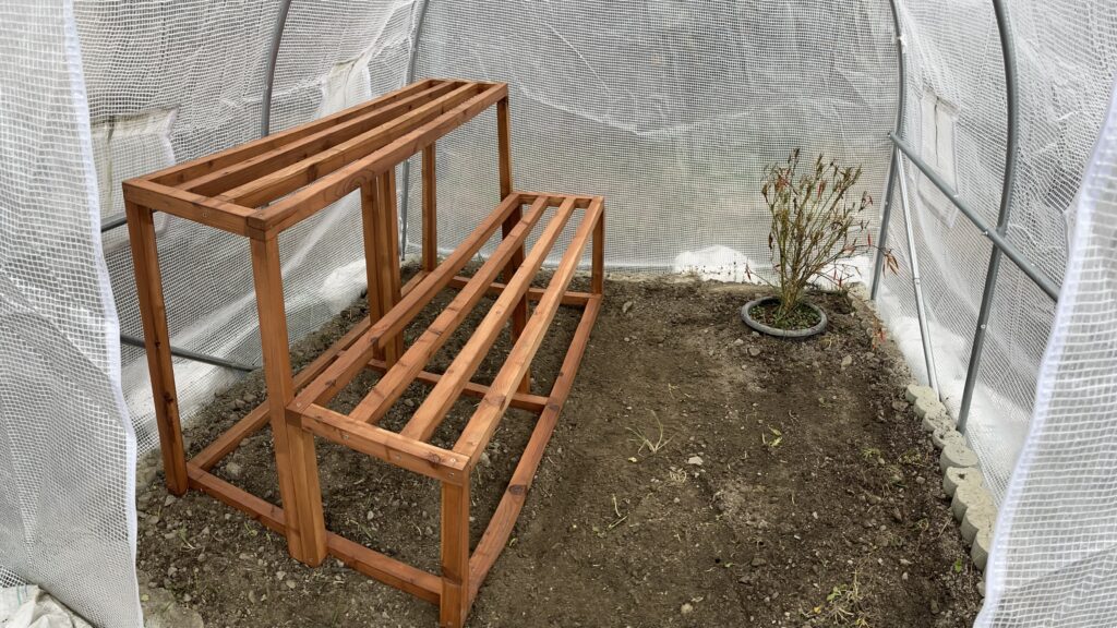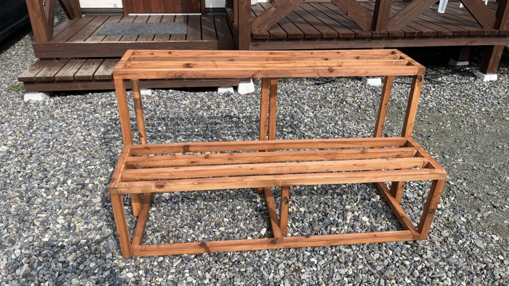 仕上げは木材保護材を塗布して耐久性と見栄えをアップグレード。温室の中の使用がベースなので基本雨風の心配は特になし。一回塗りで完成。温室に設置しましたが、「ダウンサイジングしておいて良かった!」とホッと胸を撫で下ろした感じです。原案だと大きすぎてやり場に困ったと思います。また作業場でも果たして組み立てることができたのか、作る場所を考えての設計が大事だと、ちょっと冷や汗ものでした。でも完成した育苗棚は、とても愛おしく何とも言えない達成感を感じます‼️