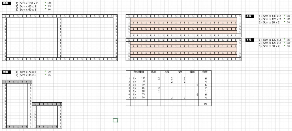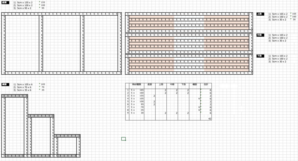 いっそのこと購入しようかと、カインズに行ったりAmazonを見たりしましたが、「やっぱりカスタムメイドでしっかり作りたいなー」と思いました。通販は¥3,000-¥5,000で木製、金属製で結構お手軽に手に入りますが、前回「自動灌水用タンク台、改め百葉箱」を作っていたので(家庭菜園レビュー2)、それが結構大きな動機となりました。早速エクセルで設計図を作ってみました(百葉箱もこのやり方)。階段上の3段置きで温室の半分くらい収まるサイズで設計しました。