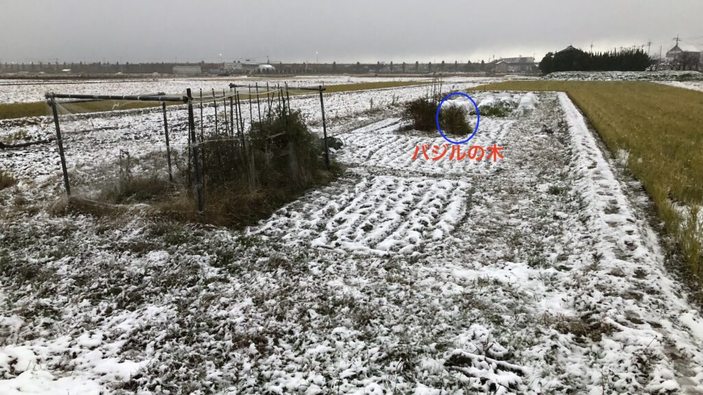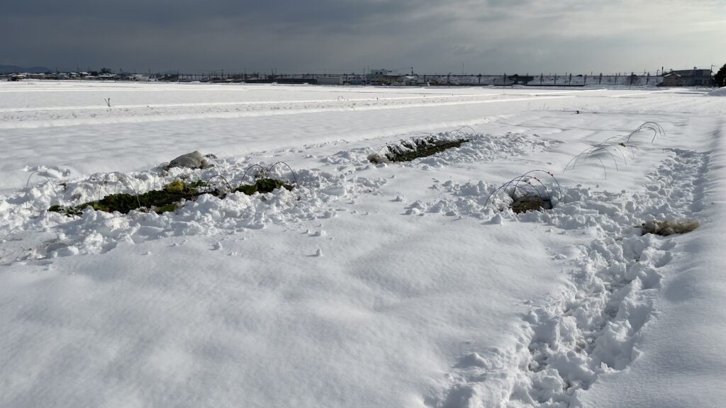 滋賀県高島市も1月の寒波では北陸地方の直ぐ南あたりなので、一晩で40-50cmほど積雪しました。思ったより雪は多くて家の前の雪かきも結構大変だったので、畑を見に行きました。一面真っ白な素晴らしい風景で、「雪原の美」という言葉が頭に浮かんできました。同時に寒冷紗と不織布で覆った野菜は大丈夫かなと胸騒ぎを直感しました。