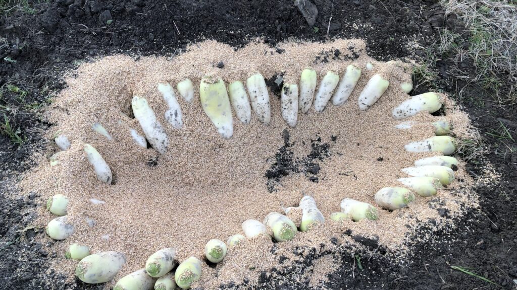 1/7に穴を掘って籾殻を寝床に土で覆って保存