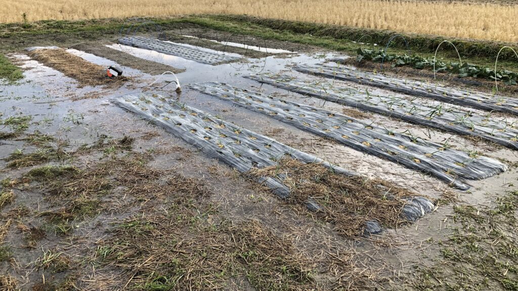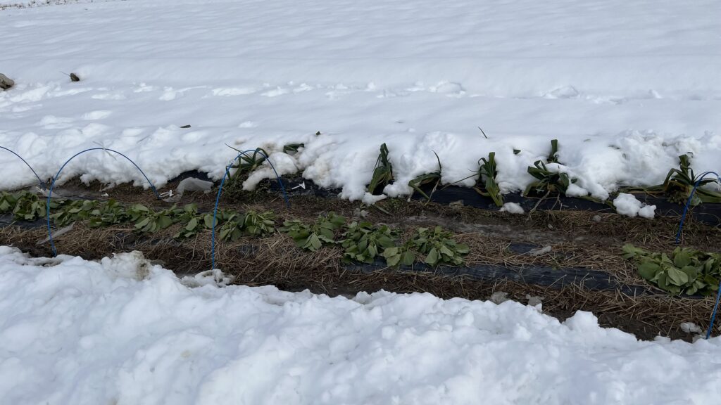秋に定植したものは、大体が越冬の必要があるもので、基本は籾殻と米藁を株元に敷いて保温対策をしていました。雪の中で本当に大丈夫なんだろうかと半信半疑でしたが、植物も冬眠するようなのでそれを信じての準備をしました。しかし小さい苗、ある程度成長しているものは不織布や寒冷紗で保護した方がいいような気がしていて、白菜、そら豆、スナップエンドウはそうしました。